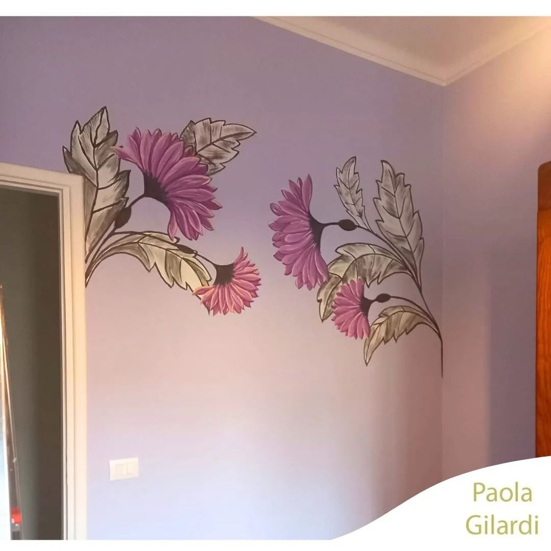 Imitazione di carta da parati, reinterpretata e dipinta direttamente sul muro, integrandola perfettamente con lo spazio, le proporzioni e lo stile della stanza.